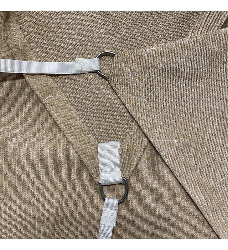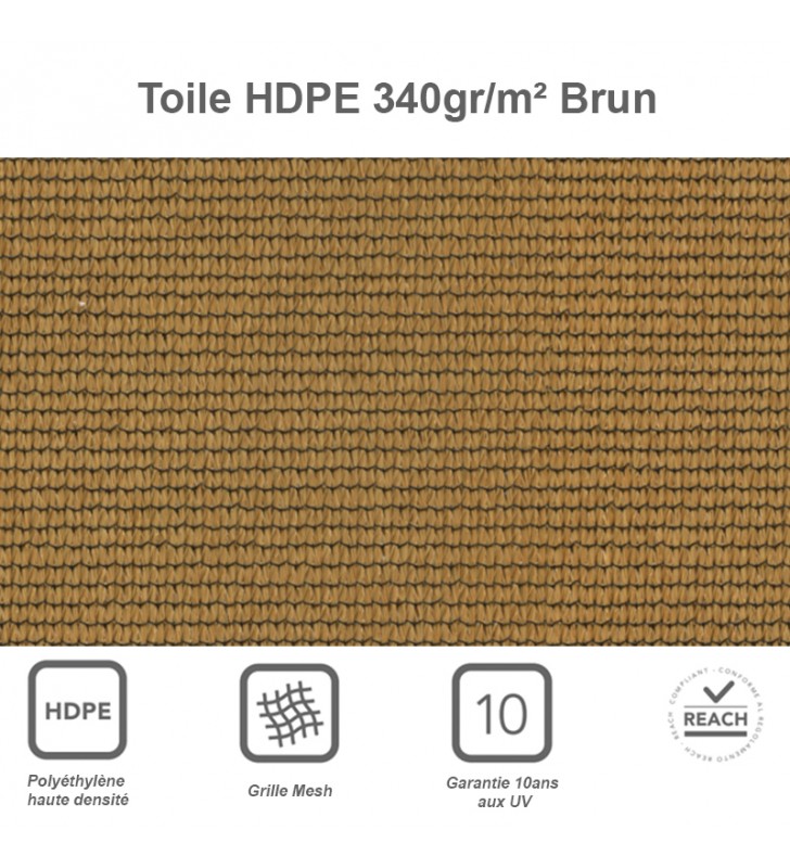 Voile d'ombrage (ou toile tendue) pour extérieur : terrasse, pergola, jardin, balcon… de dimensions 2,00 x 2,50 m (rectangulaire). Toile polyéthylène haute densité très résistante (340gr/m²) de couleur brun. Confection par sangle 40mm dans un ourlet sur le pourtour avec anneau demi-rond à chaque angle. Sa durée de vie est de 10 ans environ. Pour la fixation, nous vous fournissons 1,50m de sangle 25mm par angle.
